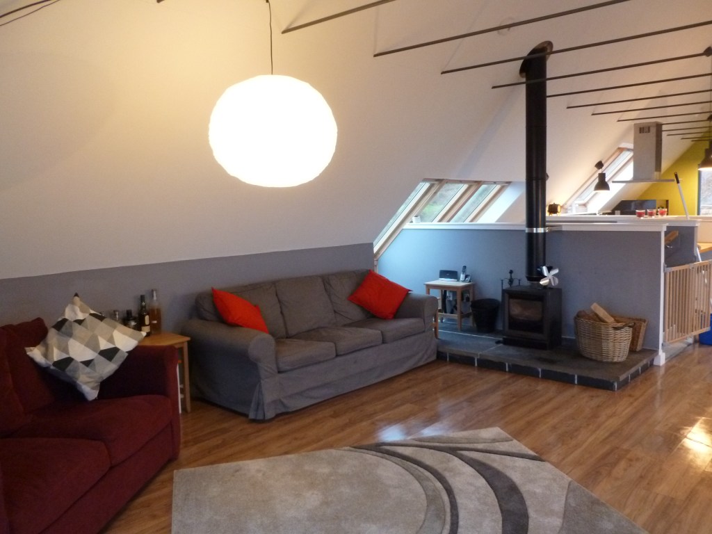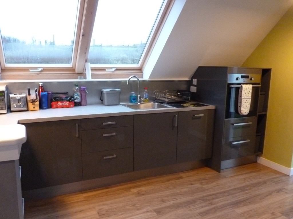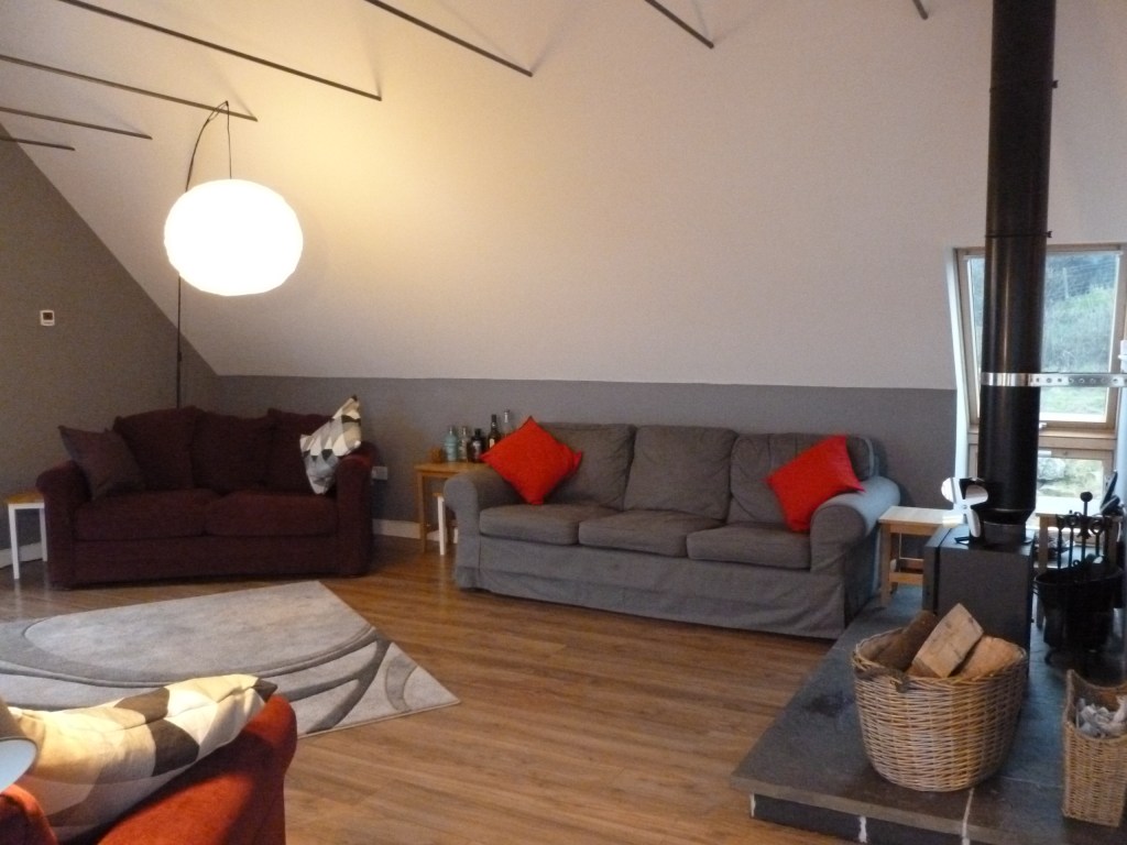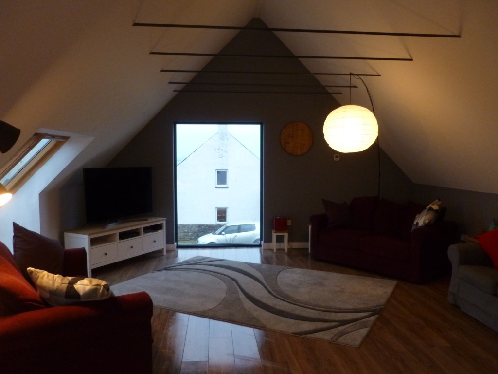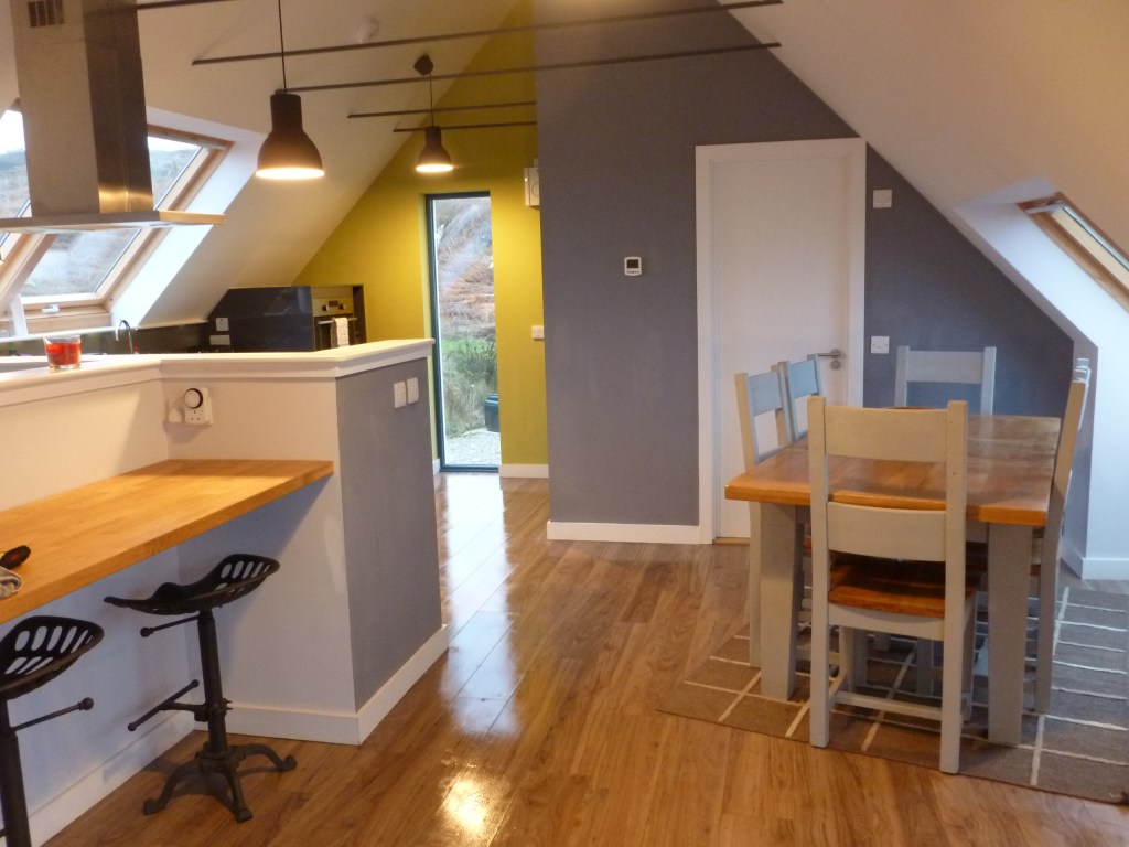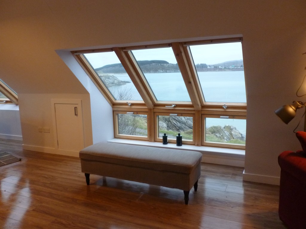 Lach Mhara has an open plan living space upstairs which comprises the kitchen, living room and dining space which provides stunning views across the bay from sunrise to sunset.